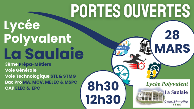 Publié le lundi 5 février 2024 16:01 - Mis à jour le samedi 28 mars 2026 21:10Venez nombreux.ses à la découverte de la voie générale et des filières technologiques et professionnelles du lycée la Saulaie, le samedi 28 mars 2026 de 8h30 à 12h30 -