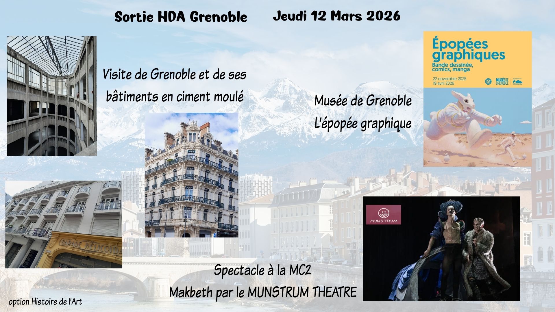 La classe de l'option Histoire de L'Art en visite à Grenoble le Jeudi 12 Mars 2026 avec au programme : visite de la ville, Musée de Grenoble pour l'exposition autour de la BD et des Arts Graphiques et soirée Théatre à la MC2 pour MAKBETH