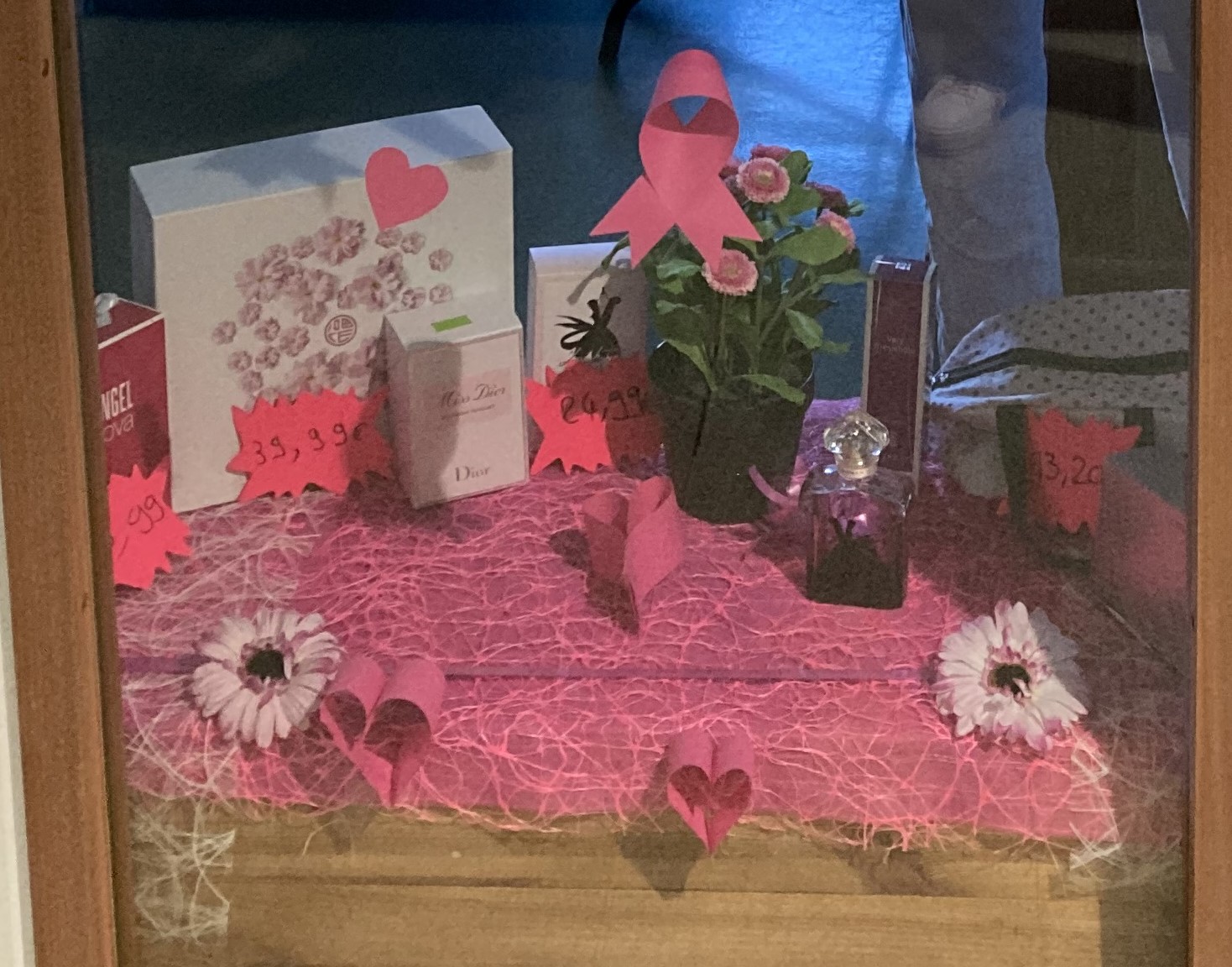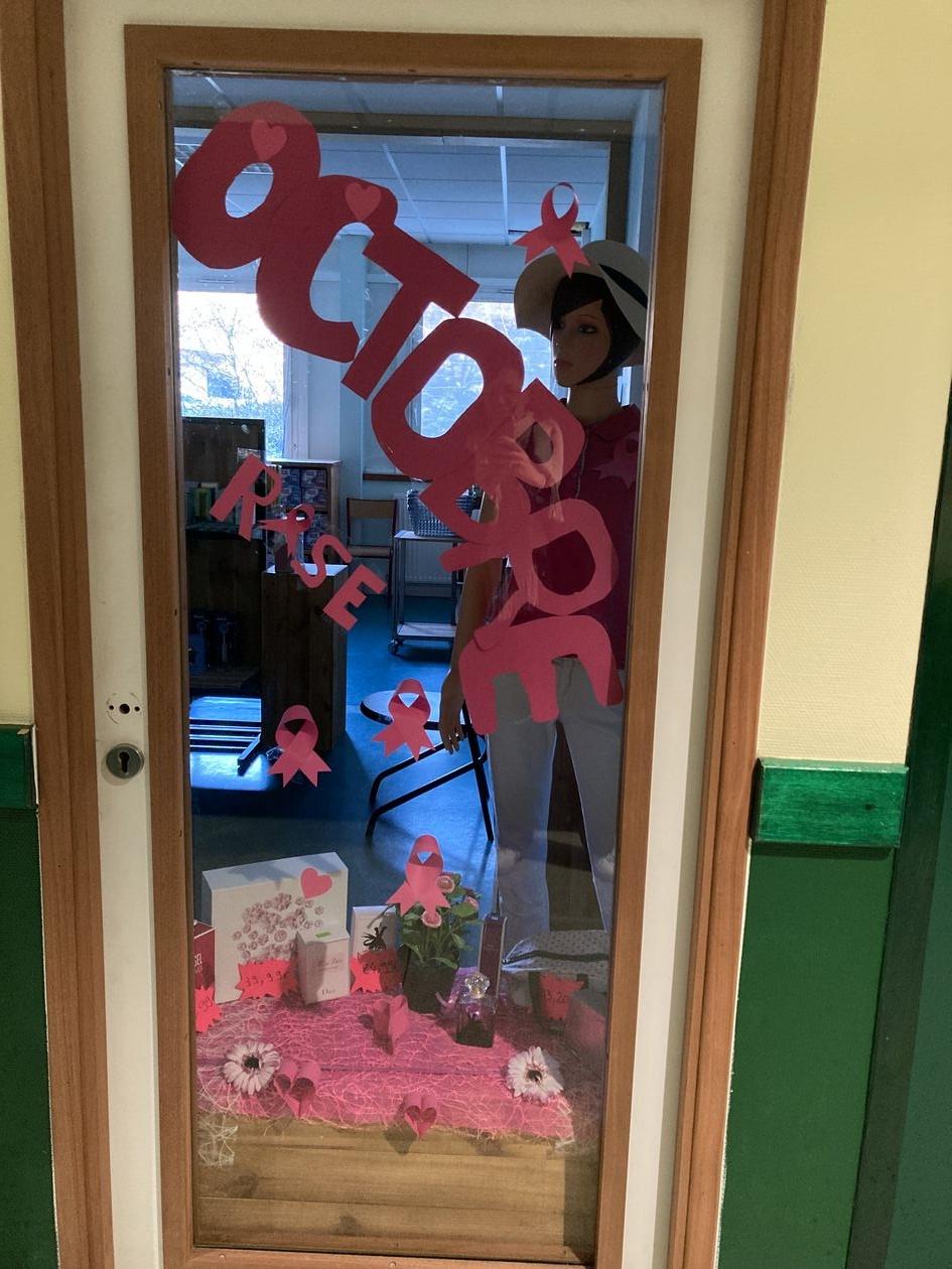 À l’occasion d’Octobre Rose, la vitrine du magasin pédagogique du lycée se pare de rose pour soutenir la lutte contre le cancer du sein.